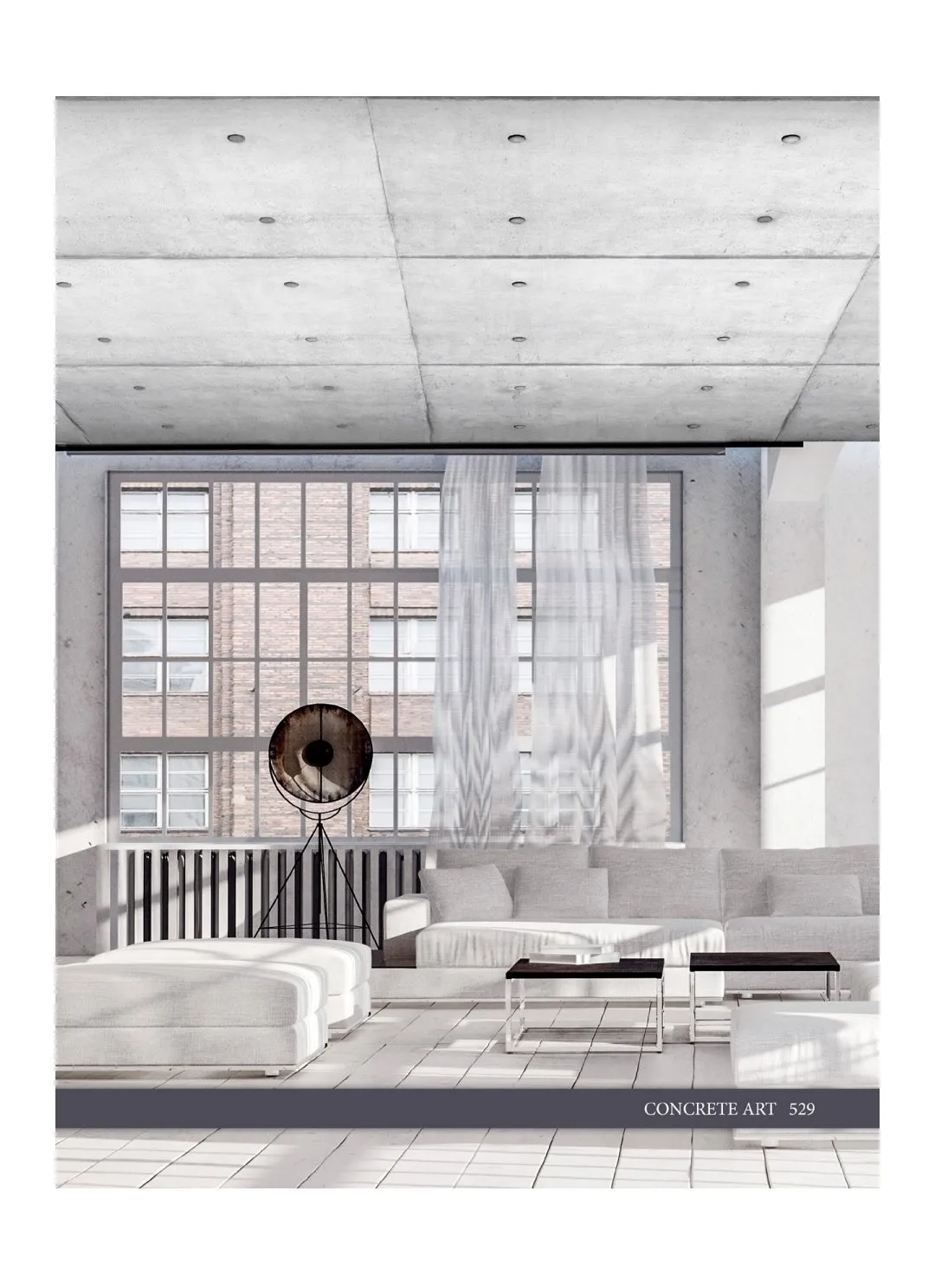 Современная эстетика — реалистичная имитация бетона от светло-серого до насыщенного антрацита гармонично сочетается с кирпичом, деревом, стеклом и другими материалами. Это удачный пример оформления потолков в интерьерах в стиле лофт, индустриальный, минимализм.