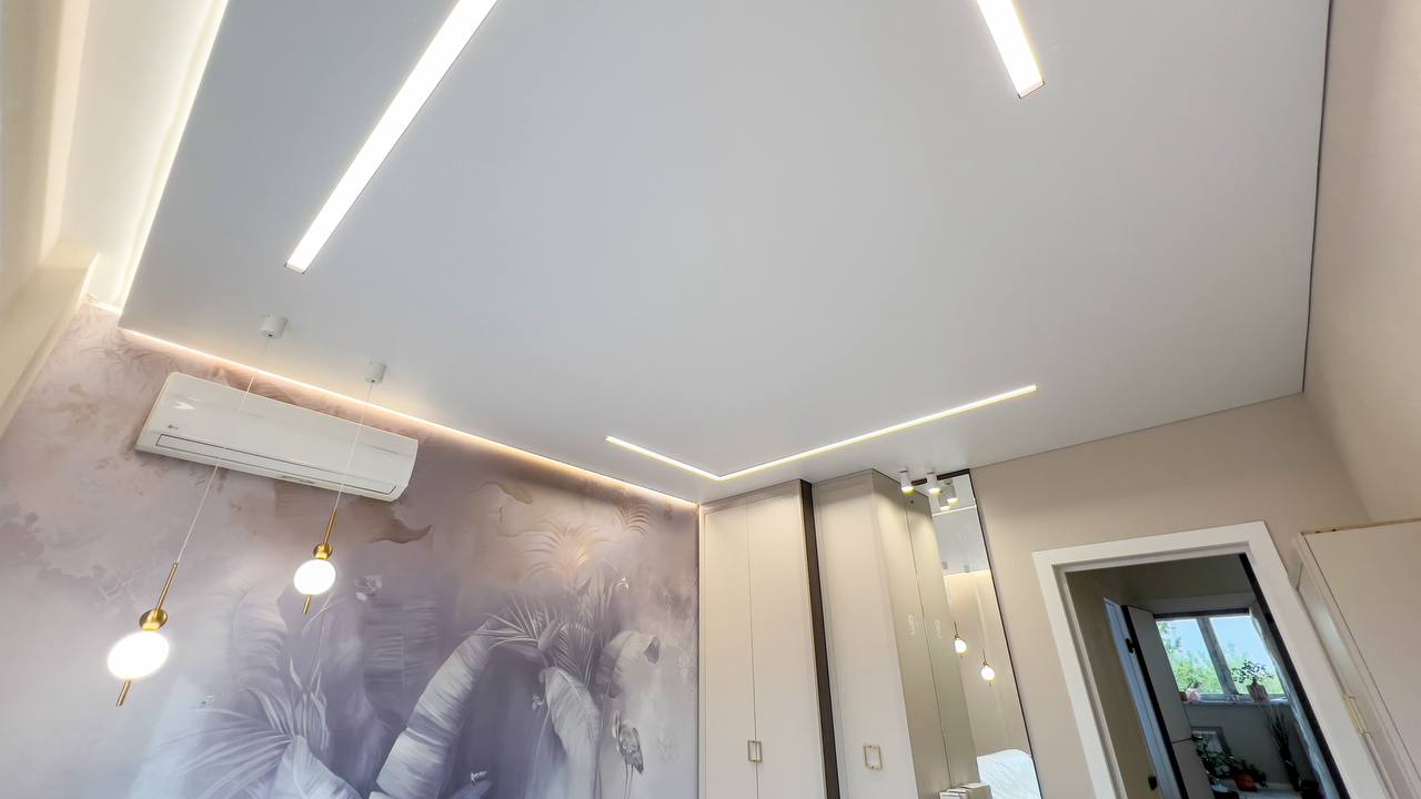 Эти покрытия подходят для одноуровневых и многоуровневых потолочных конструкций. Можно организовать контурную светодиодную подсветку, создать необычный эффект с помощью теневого профиля.