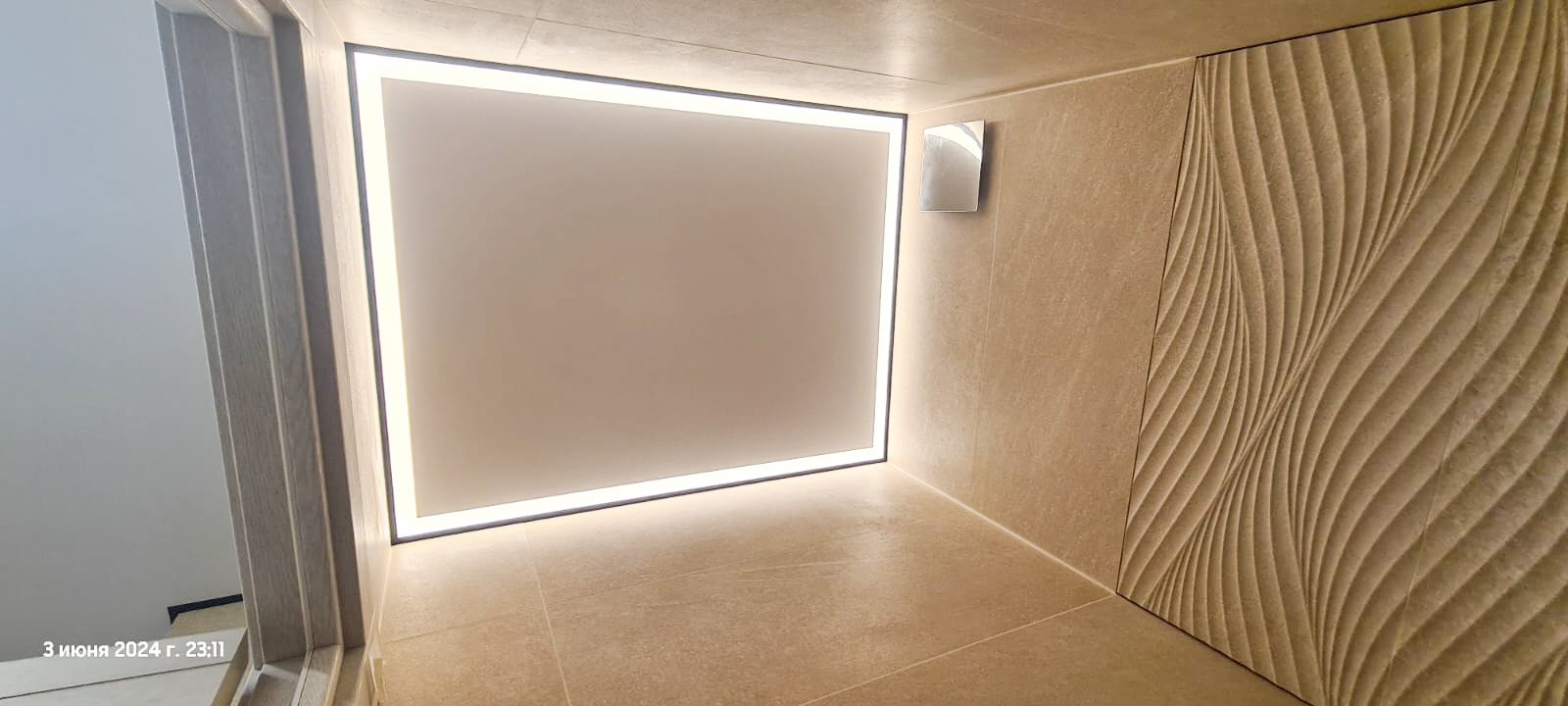 Сама подсветка может быть одноцветной и многоцветной. А натяжное полотно — пленочным или тканевым. ПВХ-пленки и тканевые покрытия по фактуре бывают глянцевыми, сатиновыми и матовыми. Выбор типа фактурной поверхности зависит от размера и стиля дизайна комнаты, личных пожеланий клиента.