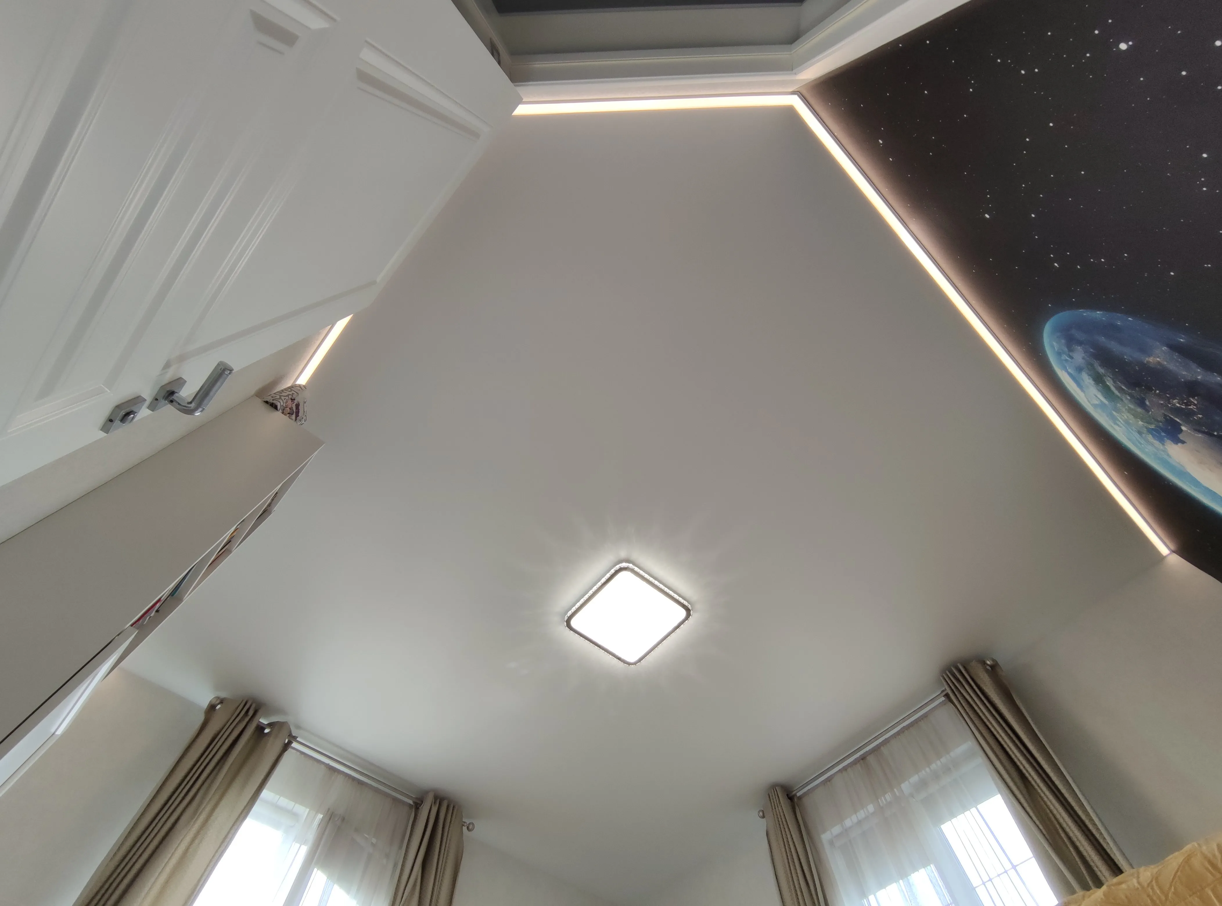 Натяжной потолок с контурной подсветкой — оригинальное решение для спален и гостиных. Они создают красивый световой эффект и уютную, спокойную атмосферу. Заказать потолочную систему с подсветкой по периметру комнаты в Мытищах по доступной цене можно в нашей компании «Седьмое небо».